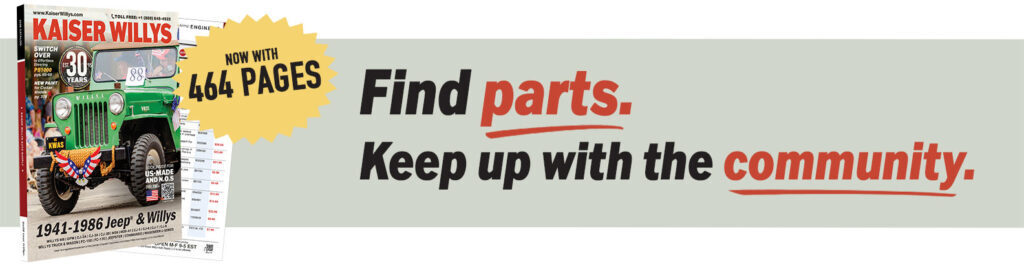 Order your FREE COPY today! Our 2025 catalog includes 80 new pages for 2025, with a total of 452 pages! Full color, detailed illustrations and parts descriptions, including our "Willys Jeep Life" Blog Highlights, interviews with owners and organizers in the Willys Jeep community, check out the new vehicles added to the Kaiser Willys Field & Restoration Guide, Willys paint & color guide, serial # guide, Jeep model references and more! Read our new articles "Tools of the Trade", "Turn Signal Switch Install and Kaiser Willys adventure at the MVPA convention in Wisconsin!