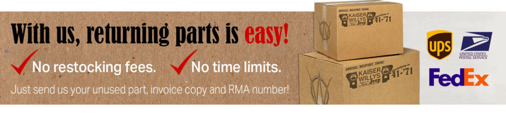 About Our Store: We strive to make your experience with us the very best, with 96% of orders shipping the next day. Plus, when you spend $98.00 or more on a single order, your shipping is FREE! Find out more about our Customer Service, request a Free Parts Catalog, or sign up for emails to get more Willys in your inbox including special discounts, Willys stories and photos, and helpful guides!